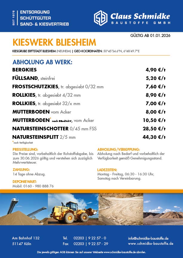 Hier können Sie sich die Preisliste des Kieswerk Bliesheim, gültig ab 01.01.2026 bis 30.06.2026, als PDF downloaden. [Download]